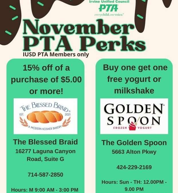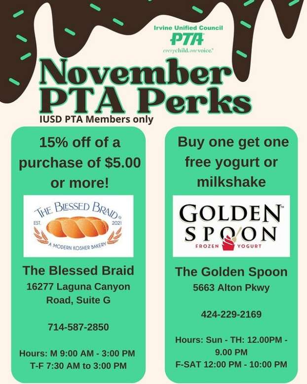 Must show flyer image below.  Valid during month of November 2024 only. MUST BE A PTA MEMBER of IUSD.