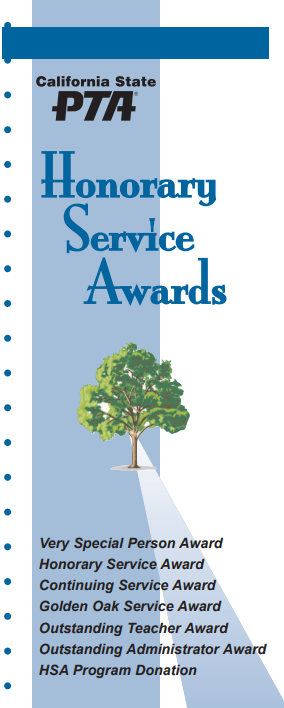 Honorary Service Awards are awarded every year to PTA’s at a unit level, council level, and district level to publicly acknowledge both individuals and organizations for outstanding community service to children and youth in a community. Net proceeds from sales of Honorary Service Awards are used to support California State PTA’s scholarship and grant programs.